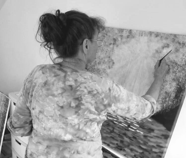 Working from observation of nature Amanda often begins a canvas en plein air, finishing in her studio. Harnessing optical mixing techniques employed by the impressionists and using a mixture of impasto, scumbling and glazing, she works expressively in acrylics or oils. With a palette knife or other mark making techniques the work is created intuitively and quite freely, so the end result is spontaneous and fresh developed as a natural process. The paintings originate from real places and woods nearby continuing the process with photographs, drawings, memory and imagination. Each painting develops layer upon layer until reaching a natural conclusion, forming contemporary paintings that lie somewhere between abstraction and realism.